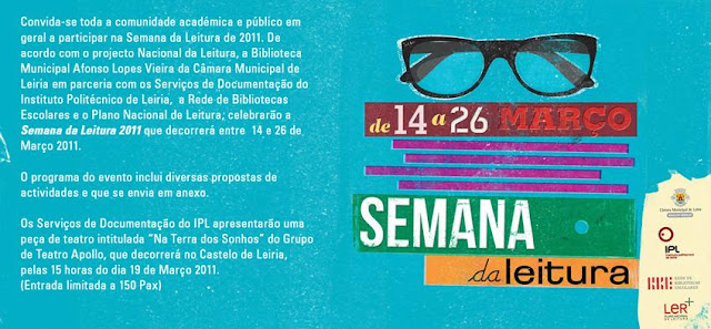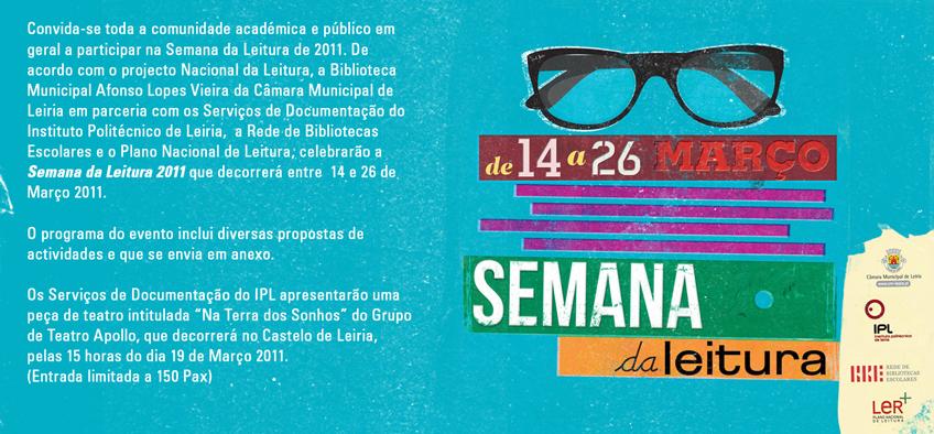 No âmbito do projecto Nacional de Leitura, os Serviços de Documentação do Instituto Politécnico de Leiria em parceria com a Biblioteca Municipal Afonso Lopes Vieira, da Câmara Municipal de Leiria, a Rede de Bibliotecas Escolares e o Plano Nacional de Leitura, celebrarão a “Semana da Leitura 2011” que decorrerá entre 14 e 26 de Março de 2011.